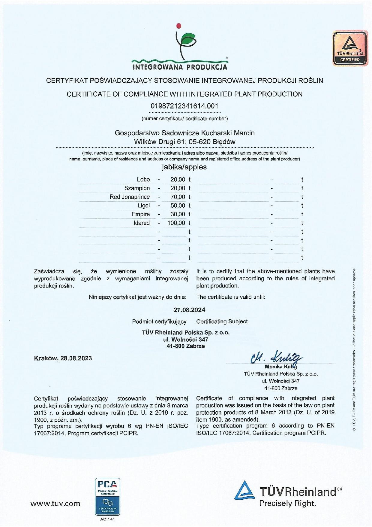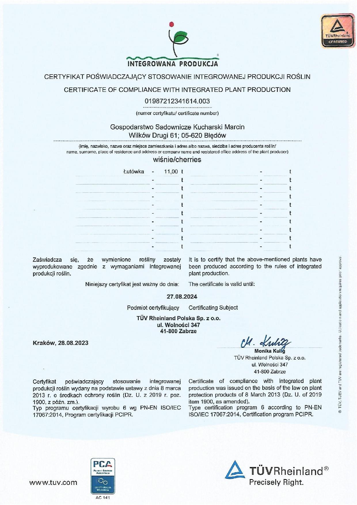 Nasze gospodarstwo posiada certyfikaty intergrowanej produkcji roślin