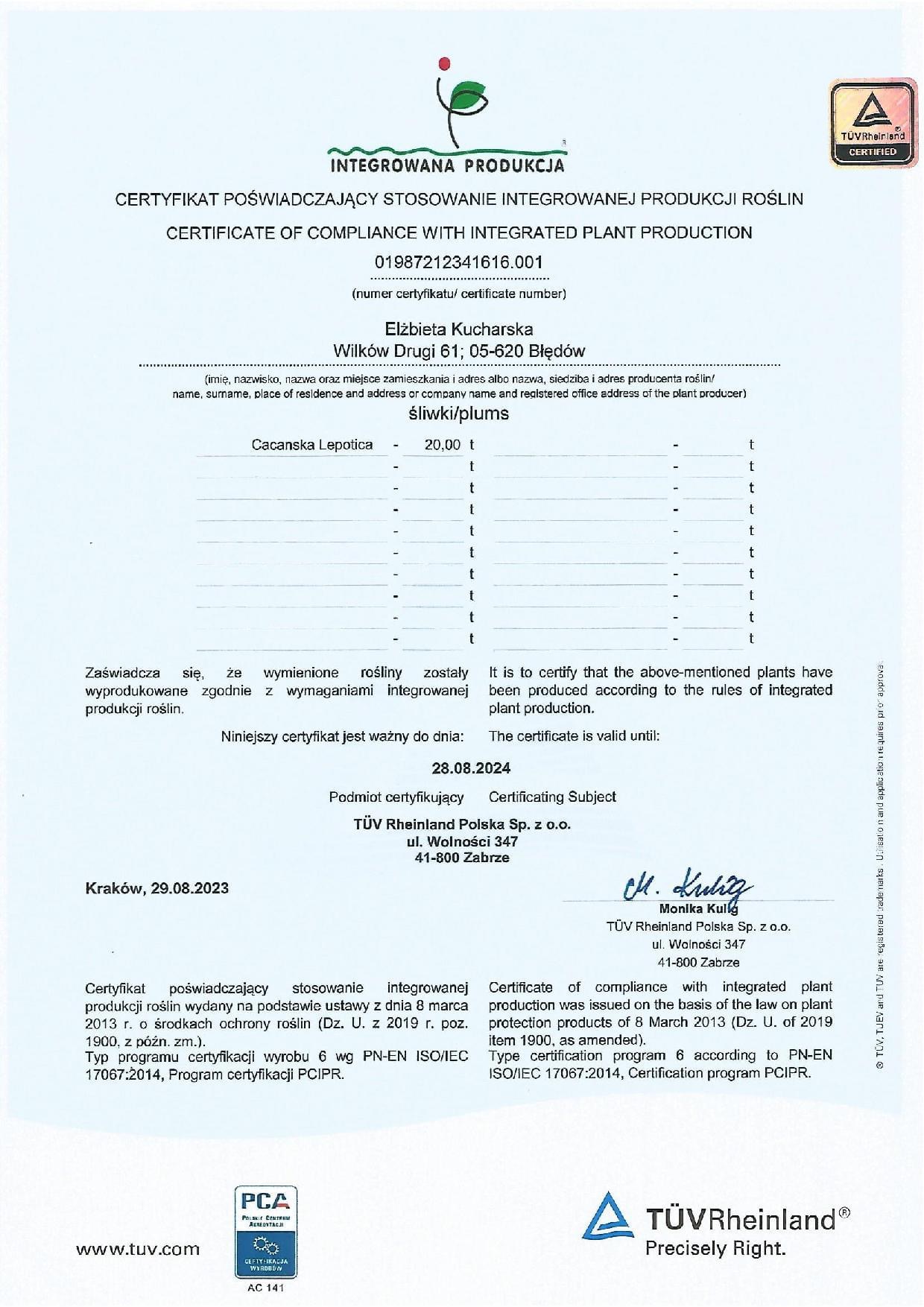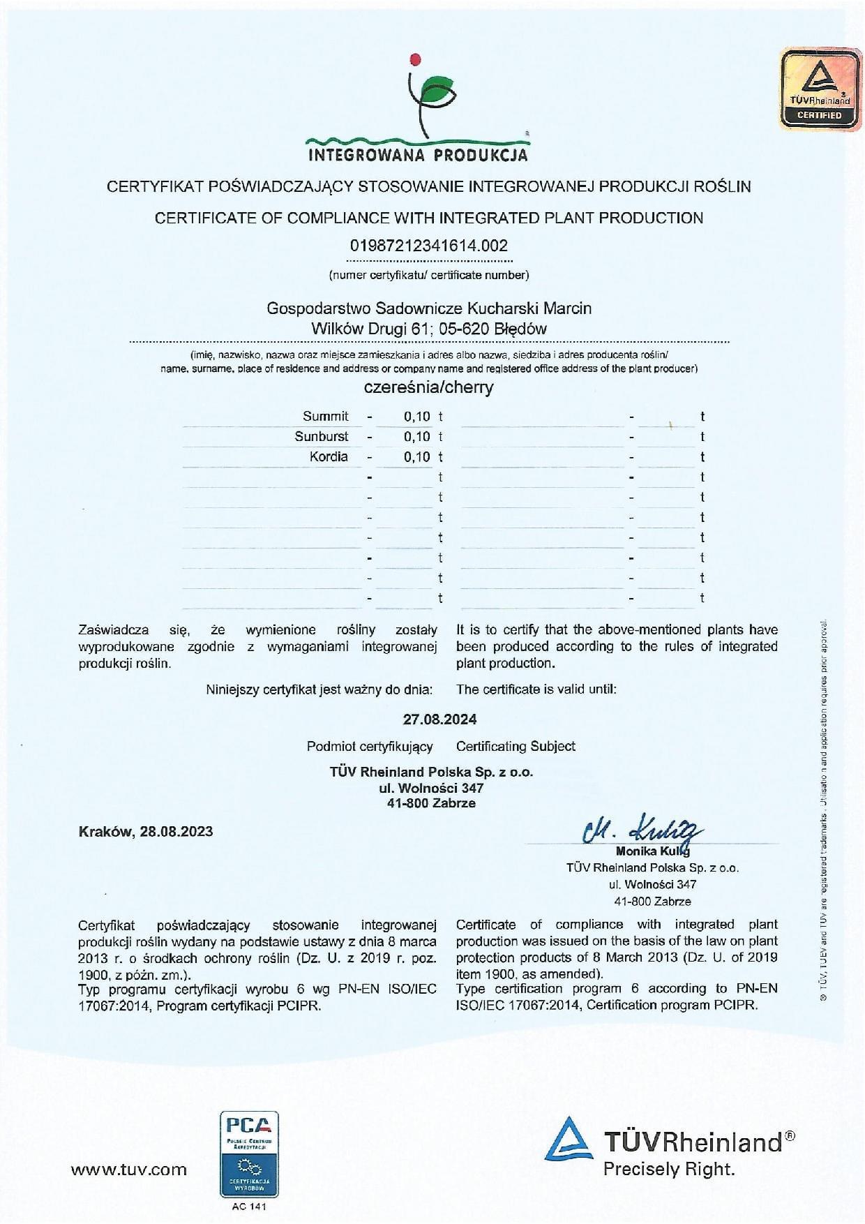 Nasze gospodarstwo posiada certyfikaty intergrowanej produkcji roślin